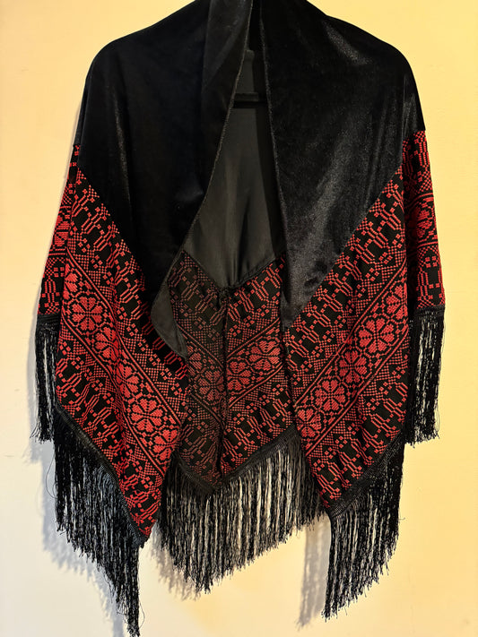 Black Velvet, Red Tatreez, and Fringe Scarf